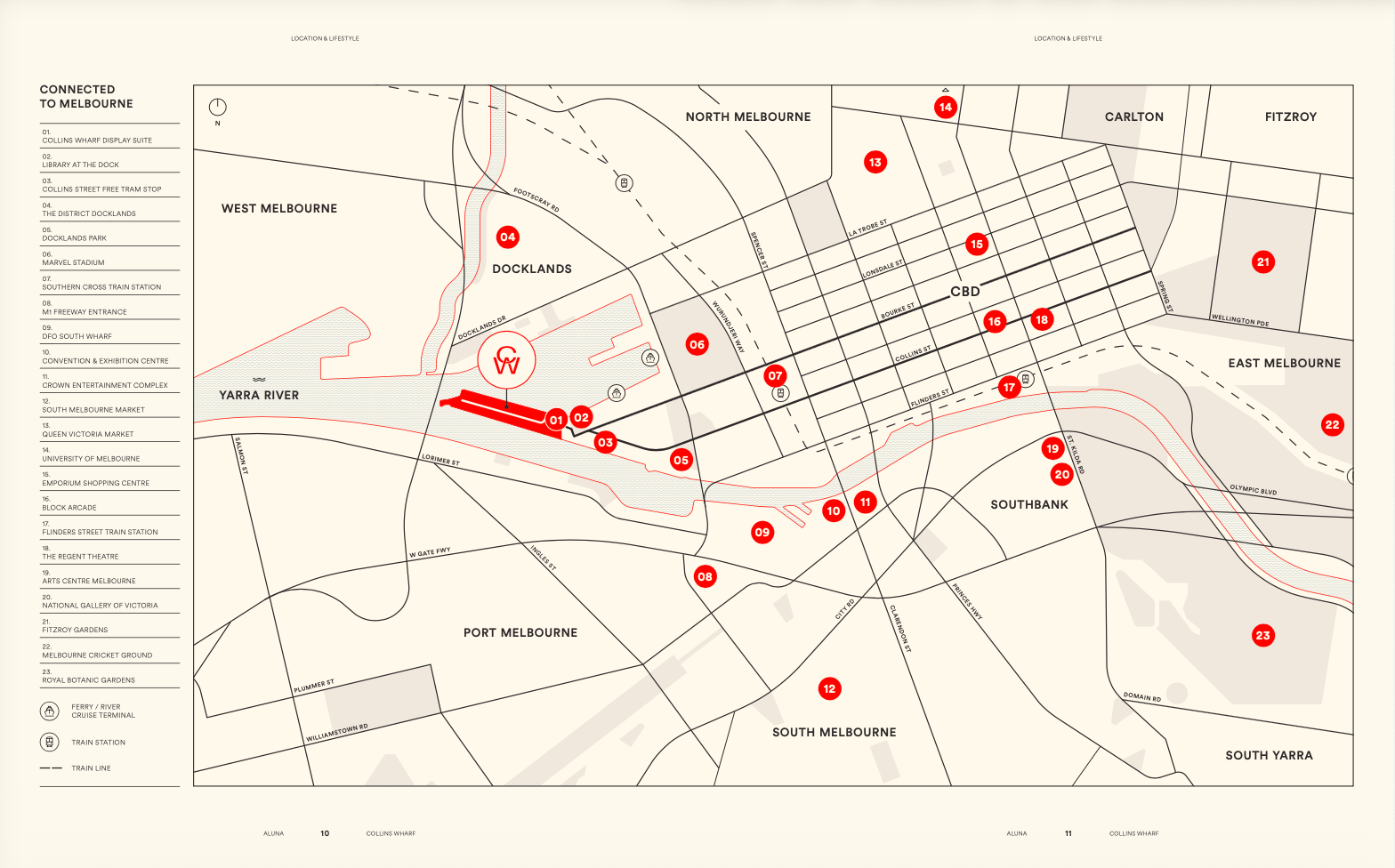 Aluna 位於 Collins Wharf 核心位置,正好處於 Melbourne CBD 與 Docklands Waterfront 的交界,擁有少數雙面臨水的地段優勢。一側是 Yarra River,另一側則是 Victoria Harbour,讓住宅能同時享有港灣、河景與城市天際線。
