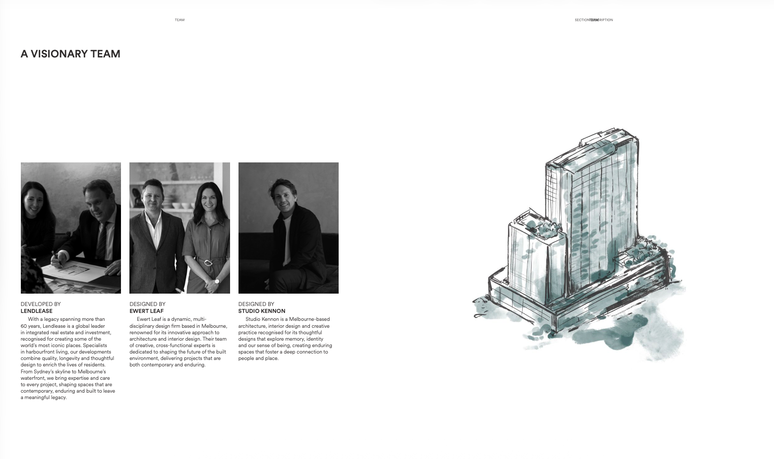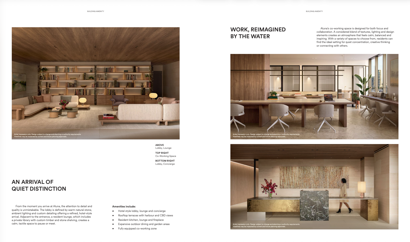 Lendlease 是澳洲最具代表性的綜合開發商之一,成立超過 60 年,長期專注於大型城市更新、水岸住宅、商辦與綜合開發項目,在澳洲、新加坡、英國與美國等市場皆有代表性作品。Aluna 的建築設計由 Studio Kennon 與 Ewert Leaf 操刀,整體靈感來自墨爾本畫家 Clarice Beckett 的作品,以柔和、層次感與對場域的連結為設計核心。
