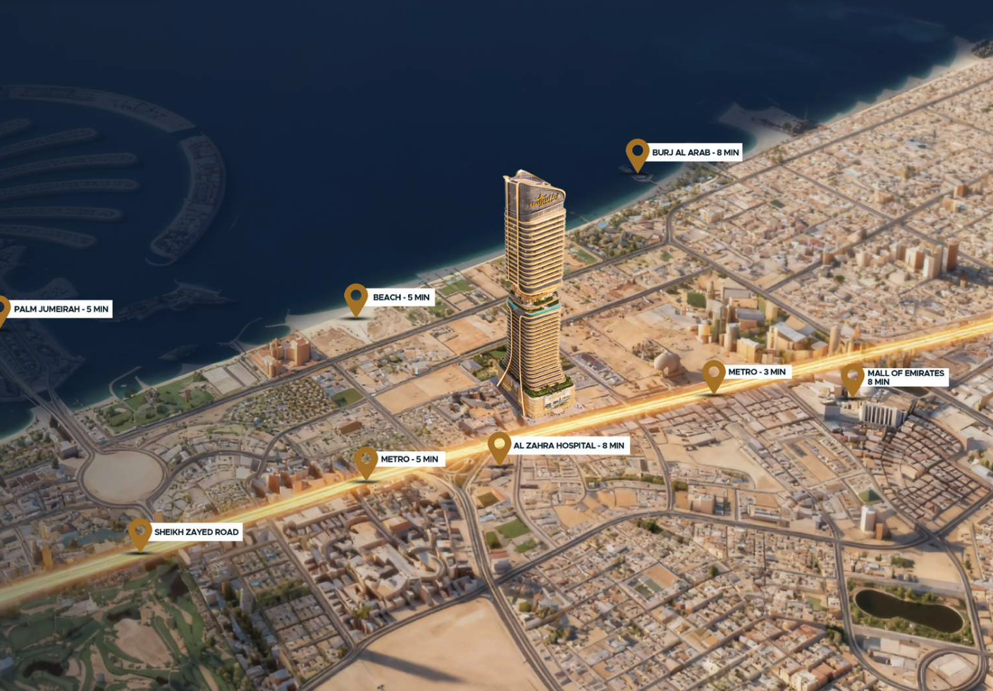 SHARUKHZ 坐落於 Sheikh Zayed Road 核心區段,