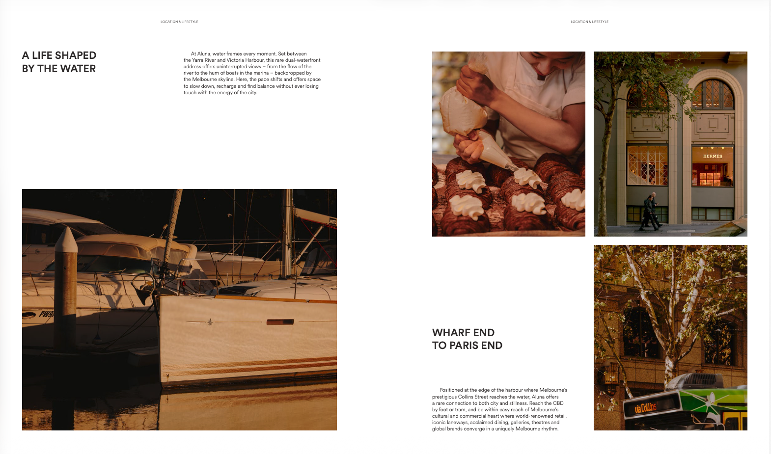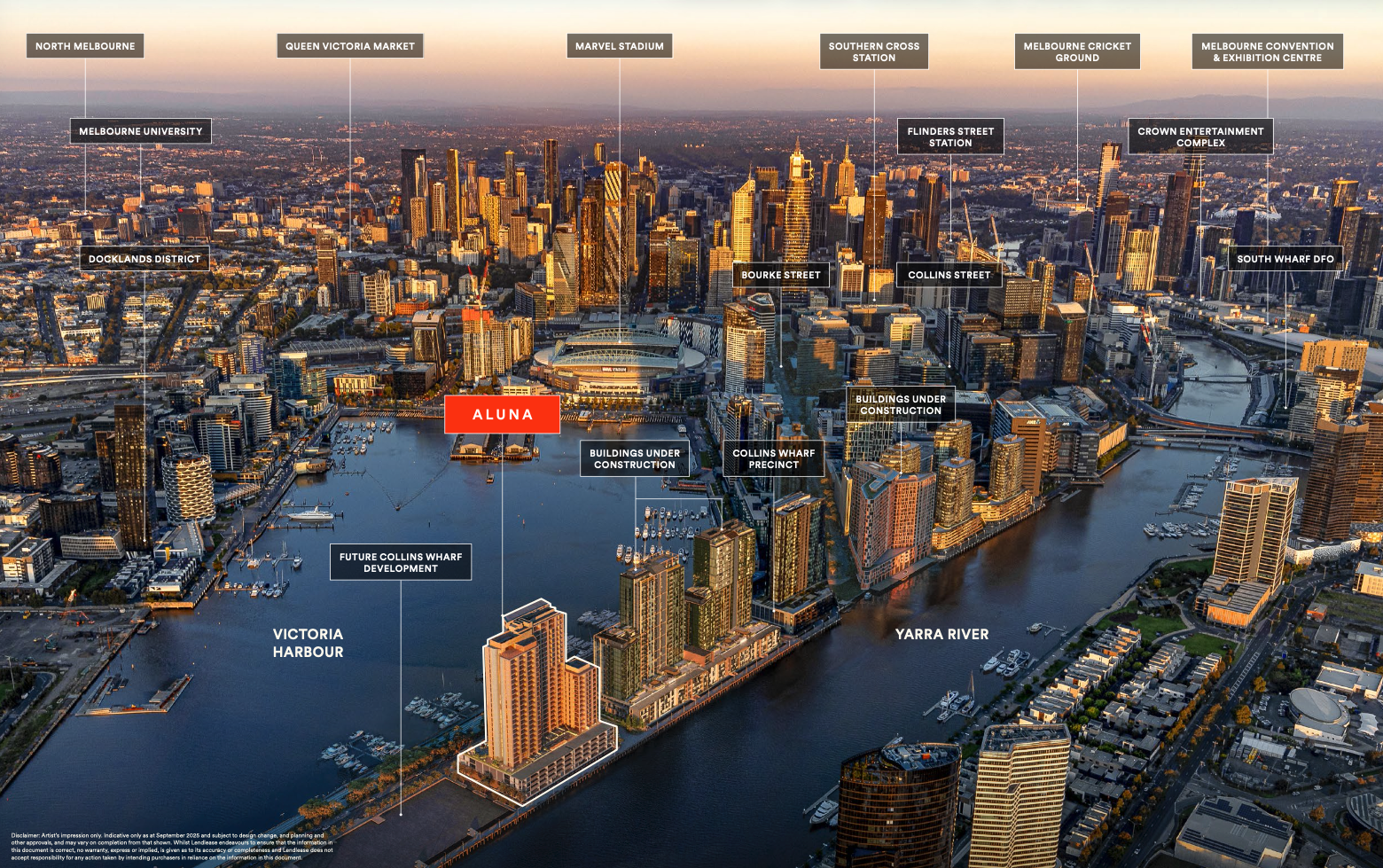 坐落於墨爾本最具代表性的水岸住宅區 Collins Wharf,Aluna 位於 Collins Street 盡頭、Yarra River 與 Victoria Harbour 之間,擁有極為稀缺的雙水岸景觀與城市天際線視野。