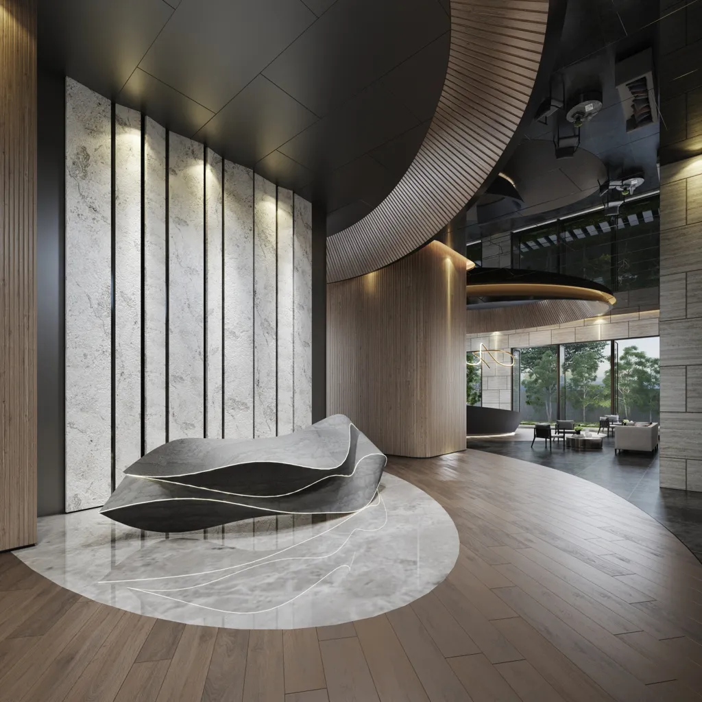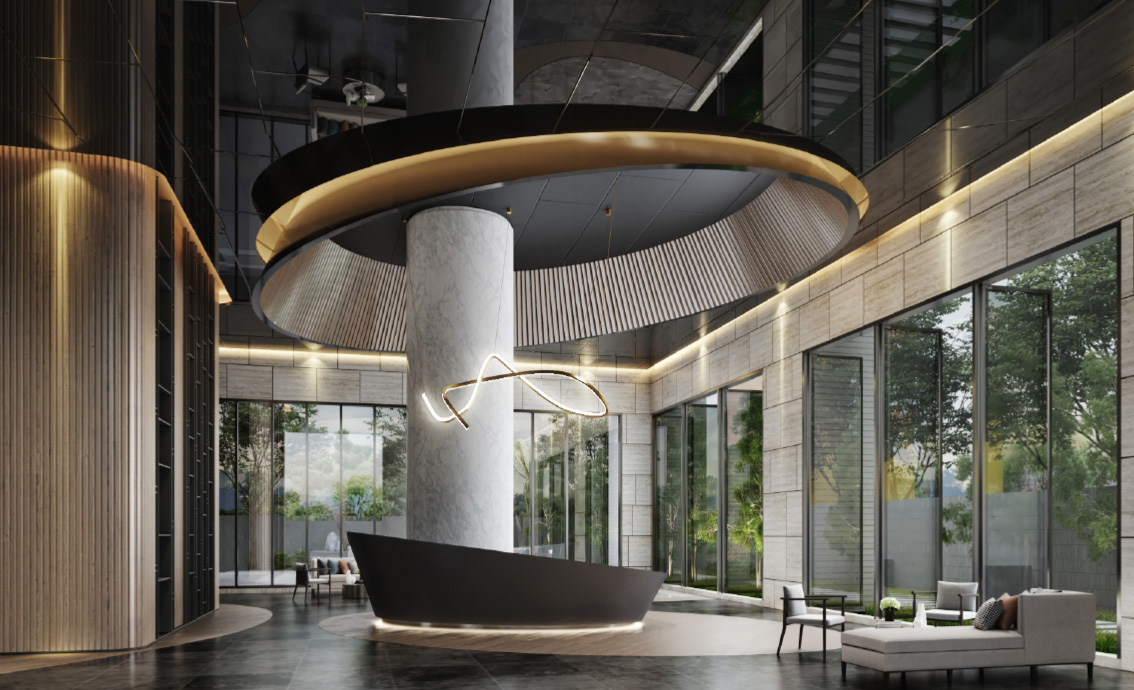 一樓設有挑高迎賓大廳、物業櫃檯、交誼廳與閱覽空間,大面玻璃開窗引入自然採光與河岸景觀。中庭則以植物園概念打造,兼具休憩與景觀功能。