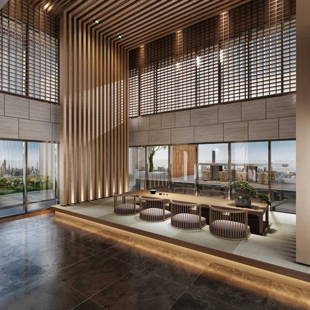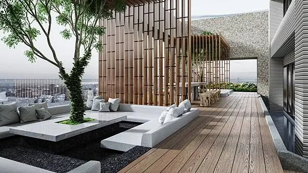 頂樓則規劃閱覽交誼區、日式茶屋、空中花園、烤肉區與曬被區,可俯瞰大漢溪、山景與城市天際線,提供完整的高樓層休閒空間。